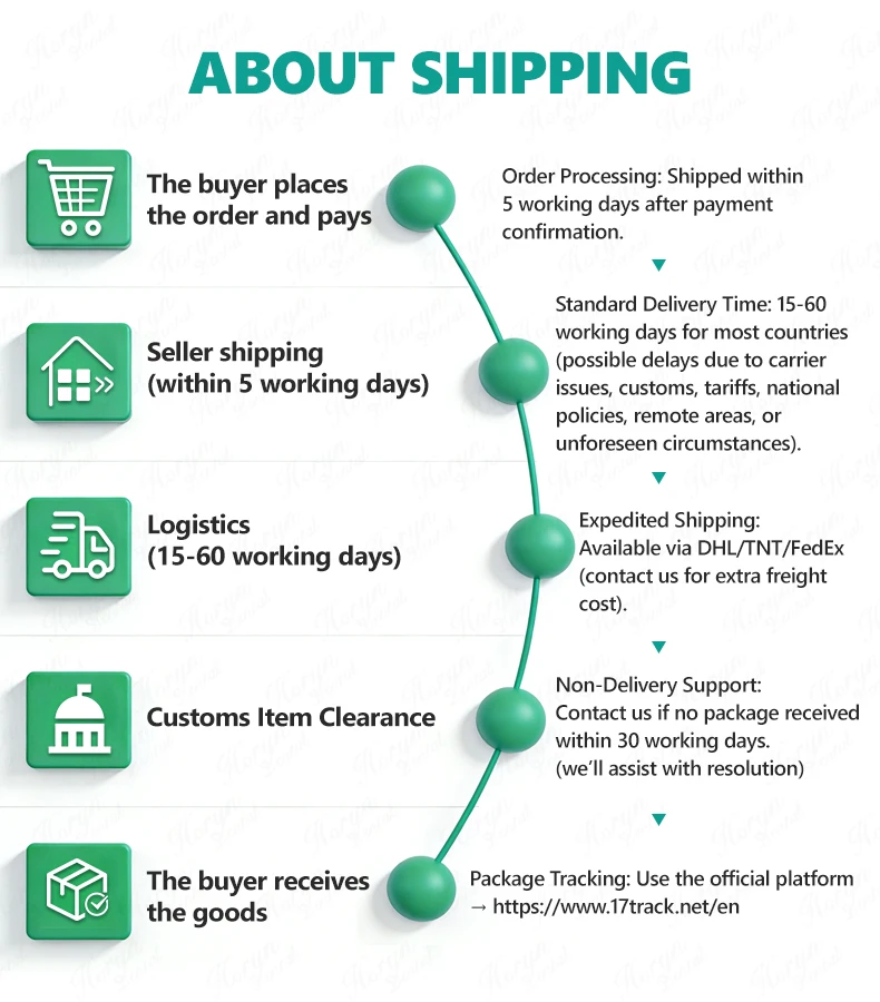 2. Most of countries delivery time is 15-60 working days. But some of goods shipping may be delayed because of carrier mishandling, customs delay, import tariffs, national policy of customers, remote areas, or any other circumstances out of our control.